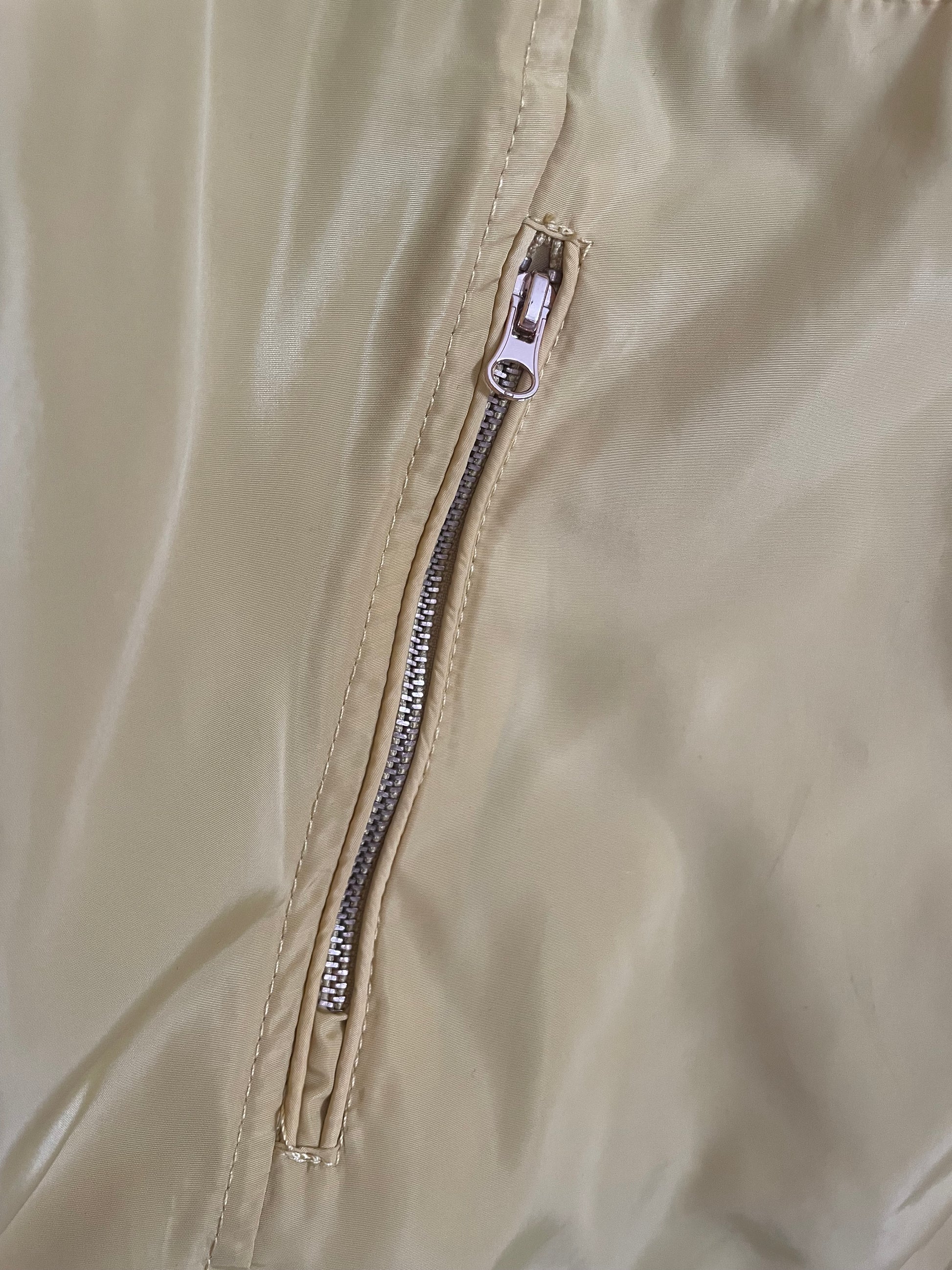 Full zip with buttons, side pockets, cinch waist at the back, hooded. Lightweight and perfect for spring and summer.