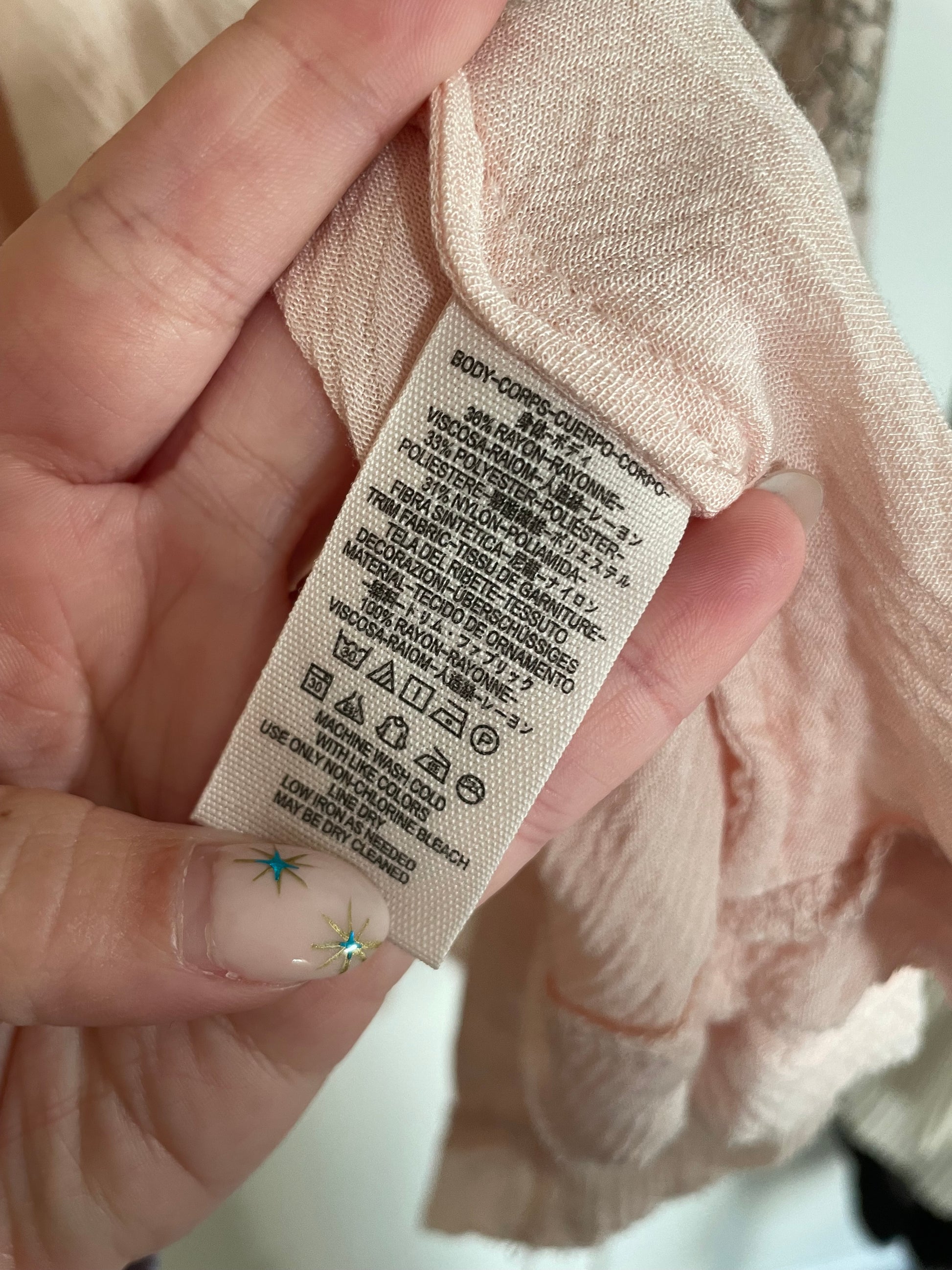 Original tags attached. This high neck tunic can be styled as a top or a dress if you add a slip (black, nude or white.) High low style in a beautiful light, blush pink color with black accents.