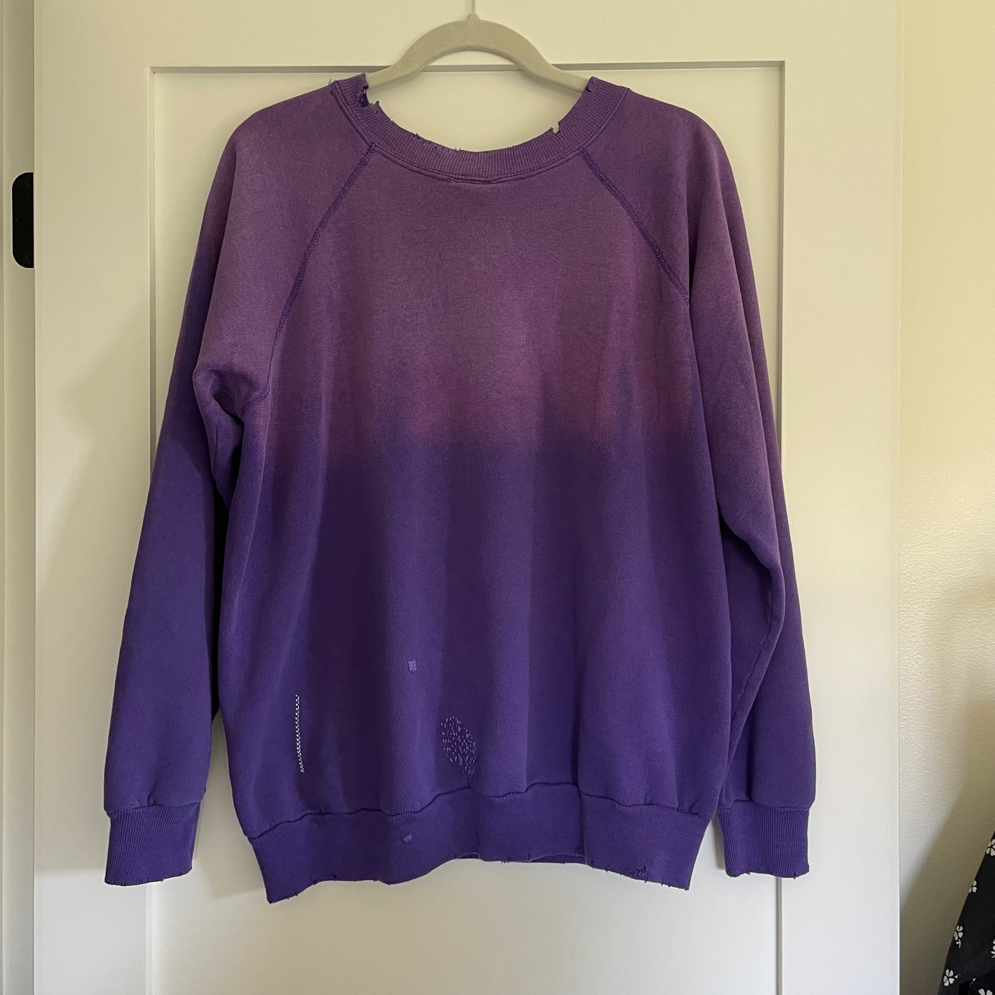 Super soft, ombré dyed purple, decorative stitching and distressing.
