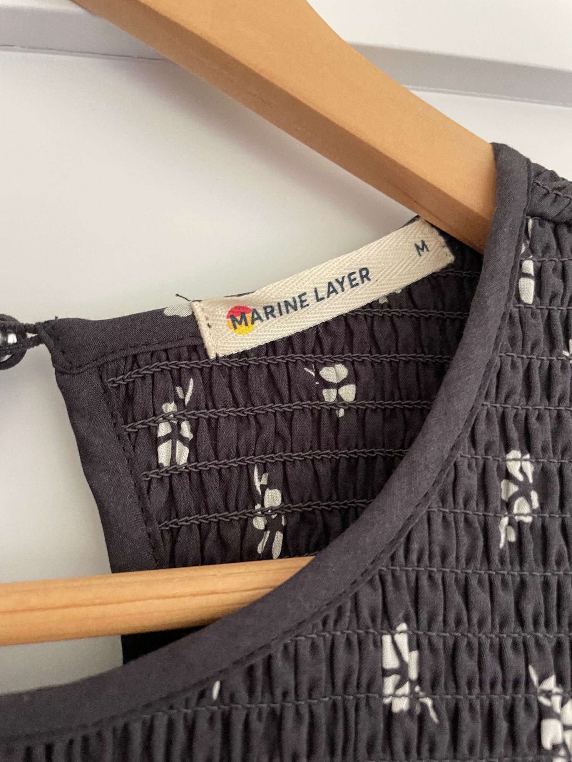 Black and cream floral print, peplum bottom, long sleeves with cinched wrists and a keyhole button back.