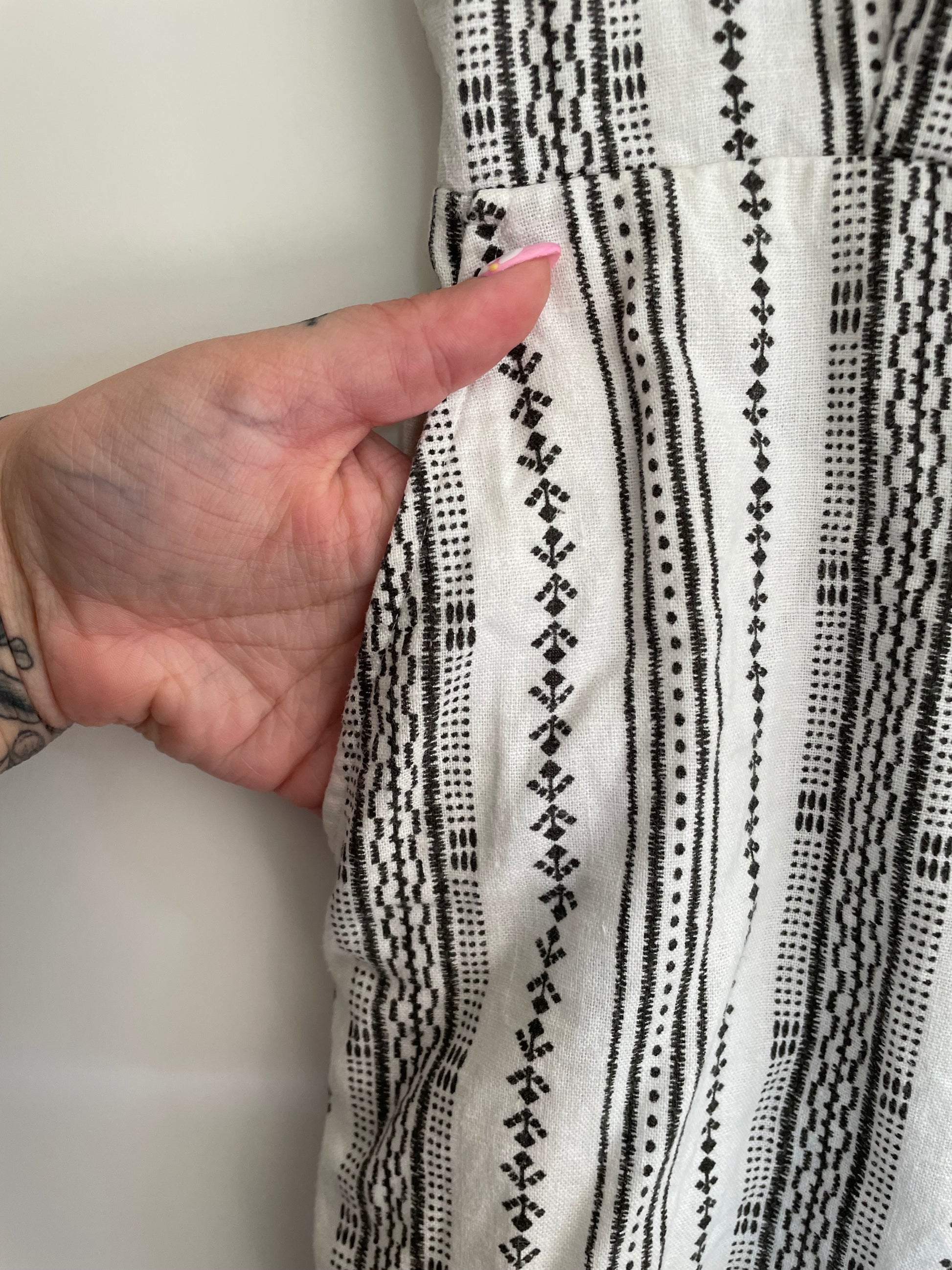 Lined linen blend jumpsuit with square neck, adjustable cami straps, pockets, smocked back and midi length bottom.