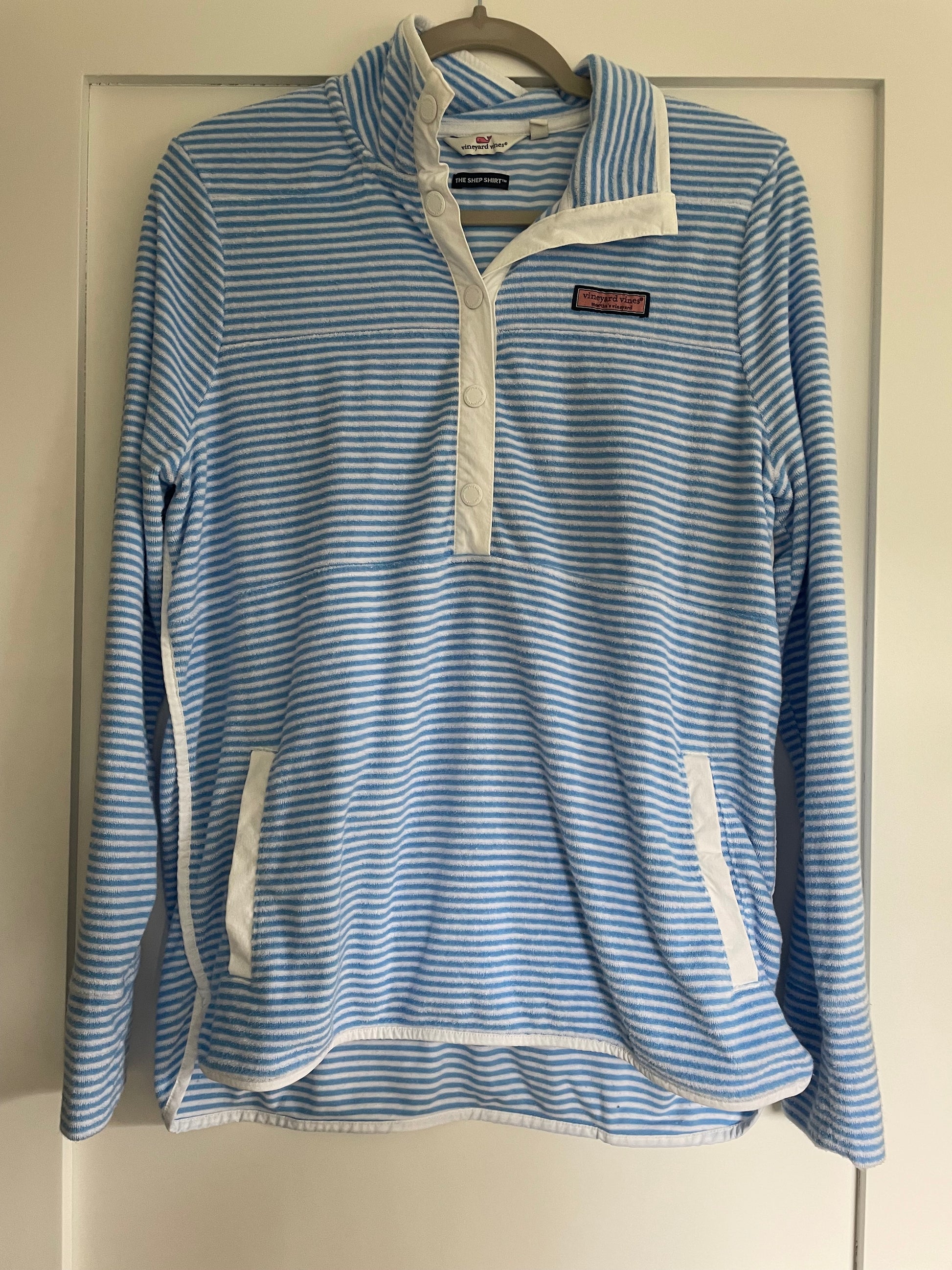 Comfortable terry material, 1/4 snap buttons and two pockets.